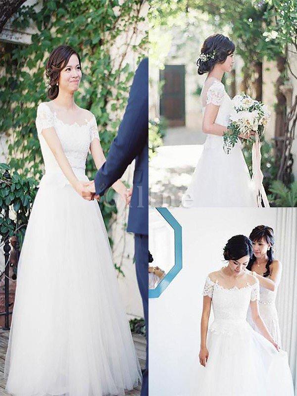 Abito da Sposa Naturale con Manica Corte Spazzola Treno in Tulle A Line