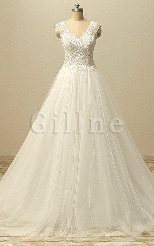 Abito da Sposa Senza Maniche Naturale in Pizzo A Line V Scollo